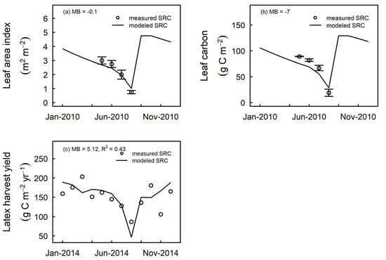 Monthly values of leaf area index (a), leaf carbon (b), and latex yield (c) of rubber plantations simulated by CLM-rubber (black line) and measured values (open circles) during the mature phase of growth of rubber plantation in SRC, Indonesia. Values of model bias and goodness-of-fit are specified as MB and R2, respectively. The measured data are taken from published studies [14,55].