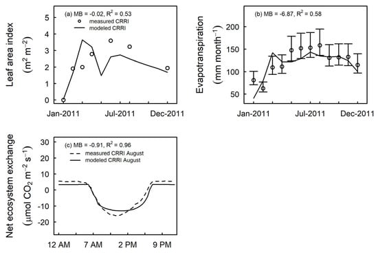 Monthly values of leaf area index (a) and evapotranspiration (b) of rubber plantations simulated by CLM-rubber (solid lines) and measured values (open circles; bars indicate the standard errors) during the mature phase of growth of rubber. Diel variations of net ecosystem exchange (c) of rubber plantations simulated by CLM-rubber (solid lines) and measured values (dashed lines) in CRRI, Cambodia, in 2011 are also shown. Values of model bias and goodness-of-fit are specified as MB and R2, respectively. All of the measured data are taken from published studies [10,15].