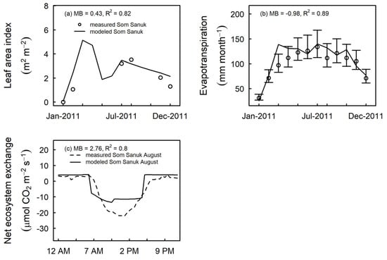 Monthly values of leaf area index (a) and evapotranspiration (b) of rubber plantations simulated by CLM-rubber (solid lines) and measured values (open circles; bars indicate the standard errors) during the mature phase of growth of rubber. Diel variations of net ecosystem exchange (c) of rubber plantations simulated by CLM-rubber (solid lines) and measured values (dashed lines) in Som Sanuk, Thailand, in 2009 are also shown. Values of model bias and goodness-of-fit are specified as MB and R2, respectively. All of the measured data are taken from published studies [10] except for NEE, which is digitized from a leaflet (https://lcluc.umd.edu/sites/default/files/lcluc_documents/Fox_1.pdf, accessed on 5 March 2019).