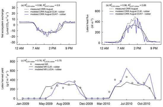 At CRRI, Cambodia, CLM-rubber and SVAT-rubber models explained a similar amount of variation in measured diel net ecosystem exchange (Figure 10a) and measured diel latent heat fluxes (Figure 10b). Still, the explanatory power of the CLM-rubber was slightly better than the SVAT-rubber. SVAT-rubber predicted a considerable amount of temporal variability—both for net ecosystem exchange and latent heat flux (Figure 10a,b). At Neban reserve, China, CLM-rubber performed similar to the LUCIA-rubber by capturing the seasonality and magnitudes of the latex harvest yield values (Figure 10c).