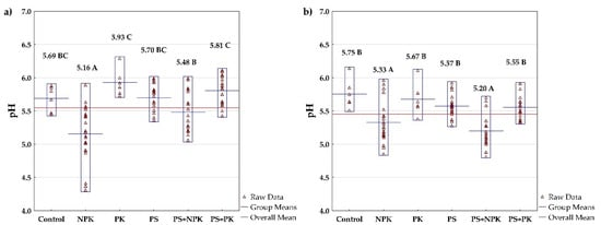 The effect of fertilizer treatments on pH in (a) Pernolec and (b) Kostelec (2015–2020). Mean values followed by the same letter are not significantly different. Red triangles represent the raw data. The blue lines represent the mean value of the particular treatment, while the red line represents the mean value calculated from all fertilizer treatments.