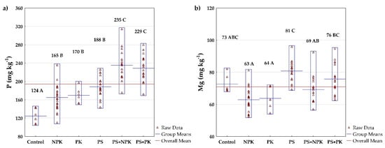 The effect of fertilizer treatments on (a) soil P and (b) Mg concentration in Kostelec (2015–2020). The differences between P and Mg concentrations as affected by fertilizer treatment were insignificant in Pernolec (Table 6). Mean values followed by the same letter are not significantly different. Red triangles represent the raw data. The blue lines represent the mean value of the particular treatment, while the red line represents the mean value calculated from all fertilizer treatments.
