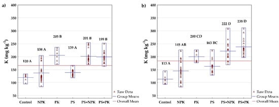 The effect of fertilizer treatments on soil K concentration in (a) Pernolec and (b) Kostelec (2015–2020). Mean values followed by the same letter are not significantly different. Red triangles represent the raw data. The blue lines represent the mean value of the particular treatment, while the red line represents the mean value calculated from all fertilizer treatments.