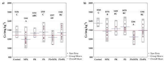 In Pernolec, the mean Ca soil concentrations varied significantly (d.f. = 14; F = 4.83; p < 0.001) between the treatments and ranged from 1113 mg kg−1 (NPK E3) to 1447 mg kg−1 (PS1) (Table 4). Similarly, in Kostelec, the differences between fertilization treatments were significant (d.f. = 14; F = 4.46; p < 0.001), and varied from 1213 mg kg−1 (PS2+NPK) to 1549 mg kg−1 (Control) (Table 5). Comparing the fertilizer groups, we find that the effect of fertilization on soil Ca content is similar in the two sites. The lowest mean Ca concentrations were recorded in NPK and PS+NPK treatments (Figure 4a,b), while application of no fertilizers (Control) and PS resulted in the highest Ca concentrations.