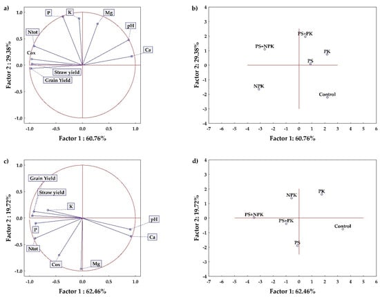 Results of the PCA—relationships between soil chemical parameters and grain and straw yields as affected by the fertilization treatments: (a,b) Pernolec, (c,d) Kostelec. Grain and straw yields are based on the average WW, SB and FP yield from 2015 to 2020.