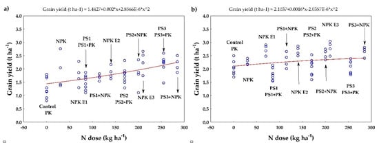 FP grain yield (t ha−1) as affected by N dose in Pernolec in (a) 2017 and (b) 2020. The average yields (blue points) are interleaved with the quadratic function (red line). The equation of the quadratic model is given above the figure.