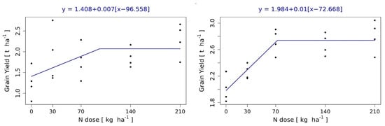 In 2020, the grain yields varied from 1.8 t ha−1 (PS1 and PS1+PK) to 2.8 t ha−1 (NPK E3). As we can see, the response to the fertilization was a little different as the weather conditions changed (Figure 6b, the red line representing a quadratic model). We can see that grain yield slightly increased with increasing N dose, as in 2017. The course of the function indicates the attainment of a local maximum, which, according to the quadratic model, is located at an N rate of 400 kg ha−1. At this rate, the maximal average yield of 2.4 t ha−1 would be achieved, which is actually lower than the yields already obtained with lower inputs (Figure 6b). According to the linear-plateau model, the response of FP yields to different rates of N doses plateaued at 73 kg ha−1, corresponding with the yield 2.71 t ha−1 (Figure 7, right), showing better weather conditions for yield development in 2020. Comparing the NUE, the highest efficiency was again recorded in NPK treatment (10.0 kg per 1 kg N applied), followed by PS2+NPK (3 kg), PS1+NPK (2.6 kg), PS3+NPK (2.4 kg), PS3 (0.4 kg) and PS1 and PS2 (−2.4 and −0.5, respectively), where the efficiency was negative as the mean yield was lower than in the Control treatment.