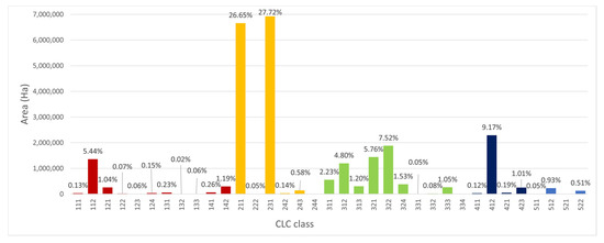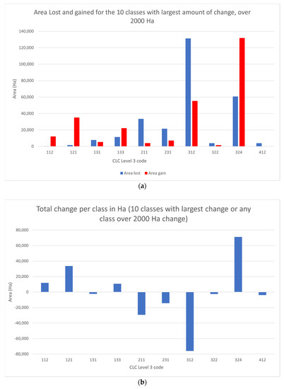 Figure 5a shows the ten CLC classes with the largest amount of land use/land cover change between 2012 and 2018 in terms of change area in hectares, and Figure 5b shows the net change (gains and losses) for those classes. These ten classes showed over 2000 ha of changed area per class.