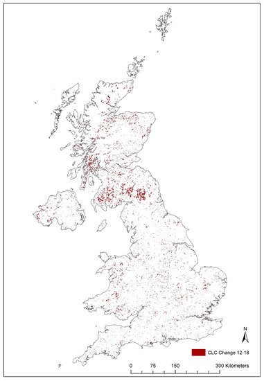 The total area of land cover/land use changes between 2012 and 2018 amount to 290,368 ha, which corresponds to 1.16% of the total land area of the UK. Most of the changes occurred around the English–Scottish border, the southwest of Scotland and in Wales, and are predominantly related to forest management, i.e., clear-cutting and replanting of coniferous woodland. The spatial distribution of changes between 2012 and 2018 is similar to those detected from 2006 to 2012. The amount and the spatial distribution of changes between CLC classes are shown in Figure 4.