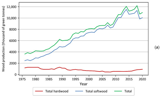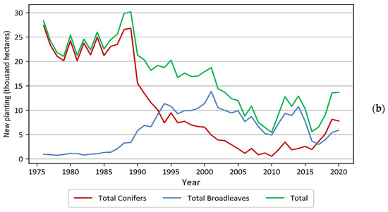 More than twice as much land of class 312 (coniferous forest) in 2012 was lost than gained. Mirroring that change, class 324 (transitional woodland/shrub) gained approximately twice as much land as it lost over the 6 years. Transitions between these two classes are representative of typical rotation forestry practices in the UK, where mature forest stands are clear-cut and then replanted. Until the replanted forest stand is sufficiently established, the land is classed as transitional woodland/shrub in the CORINE nomenclature. What is significant about the change statistics between these two classes is that coniferous forest was harvested much faster than it was re-establishing on harvested land. Even though this does not change the primary land use of coniferous forest land, it does change the total coniferous forest cover and the carbon stock stored in UK forests. Wood production has increased across the UK since 1975 [28], although since 2014 it has reached a plateau (Figure 6a). The increase in wood production is driven mainly by softwood production. Since the Kyoto Protocol baseline year of 1990, new tree planting in the UK has declined, mainly because of a drop in conifer planting, due to the ending of the tax breaks that fuelled conifer planting in the 1970s and 1980s [29,30], which has not been compensated for by the increase in planting of deciduous trees (Figure 6b). We can see this in the CLC change data, with class 312 showing an overall loss of 76,018 ha (Figure 5).