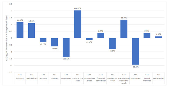 The classes 211 (non-irrigated arable land) and 231 (pastures) both lost more in area than they gained. Urban expansion often occurs on former agricultural land around cities and towns in the UK, and also farmland has been given over to renewable energy supply. The advent of government solar incentives for farmland since 2010 [27] is likely to have contributed to this apparent industrial expansion.