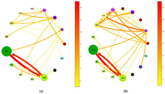 Transitions over 600 ha in magnitude between CORINE land cover classes at Level 3 for 2006–2012 (a) and 2012–2018 (b). Arrow widths and colours are proportional to the logarithm of the area of change (ha) from the CORINE change layers. Only changes over 500 ha are shown.