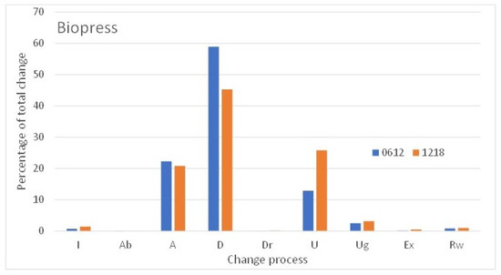 As expected from the Level 3 change results reported above, the dominant pressures are related to afforestation (A) and deforestation (D), Figure 11, but this is only the manifestation of rotational planting in commercial forestry. The BIOPRESS analysis shows that deforestation had a higher percentage of the total changes than afforestation over both periods, but deforestation declined more between the two periods than afforestation (Figure 11). These changes are also reflected by the Forest Research wood production data (Figure 6). According to these official statistics, the average annual rate of increase in wood production (slope of the trend line) reduced between 2012 and 2018 to 64,000 green tonnes per year from 397,000 tonnes per year between 2006 and 2012 (Figure 6). At the same time, the average annual rate of tree planting across the UK slowed down substantially from +380 ha per year between 2006 and 2012 to a declining trend of −930 ha per year from 2012–2018 (Figure 6). These trends are problematic in the context of the UK’s legally binding commitment to achieve a net zero greenhouse gas budget by 2050. In an assessment of pathways to achieve this commitment, the Sixth Carbon Budget for the UK by the Climate Change Committee made four key recommendations in 2020, one of which states that 460,000 ha of new mixed woodland need to be planted by 2035, increasing woodland cover from 13% of UK land in 2020 to 15% by 2035, and 18% by 2050 to remove CO2 and deliver wider environmental benefits. Additionally, 260,000 ha of farmland would need to switch to producing energy crops [3].