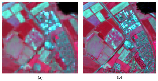 A comparison of Landsat 8 (a) and Sentinel-2 (b) data (fcc) on the same day for an area in northeast England, showing the increased resolving power of 10 m spatial resolution data (right), particularly the traffic roundabout in the centre of the image and the suburban areas in the lower right.