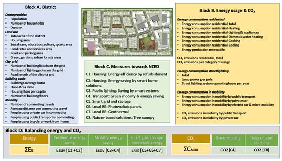 The model we propose is composed of four building blocks (A, B, C, D) which are depicted in Figure 1. Block A describes the district, Block B calculates the energy consumption and CO2 emissions, Block C includes the transition measures to NZED and Block D calculates the energy balance and the CO2 balance that document the transition to NZED.