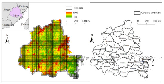 Geographical location, risk unit division, and county boundary in the Min River Basin.