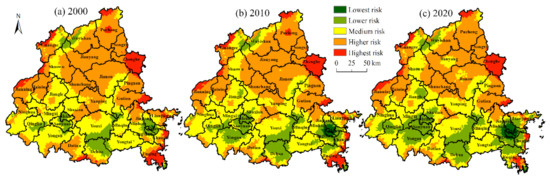 (a–c) Spatial distribution map of landscape ecological risk from 2000 to 2020.