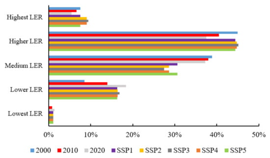- From 2000 to 2020, the LERs in the Min River Basin gradually decreased, showing a spatial pattern of “high in the north and low in the south”. In 2030, the LERs in each SSPs scenario will increase to varying degrees. Under the SSP3 scenario, the LERs are the largest, while in the SSP4 scenario, the LERs are the smallest.