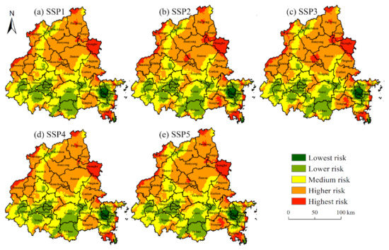 This research was based on the land use data from 2010 and 2020 to extract the land expansion of each landscape type and used the PLUS model to predict the spatial distribution of each landscape type in 2030 under the SSPs scenarios. The landscape ecological risk index was calculated using a landscape ecological risk assessment model. The results show that the LERs under each SSPs scenario will increase to varying degrees from 2000 to 2030 (Figure 3). The transition from medium- and higher-risk areas to the highest- and higher-risk areas is more obvious, indicating that the potential risk may be intensified in the future. Under the SSP3 scenario, LERs are estimated as the greatest, and the areas under highest-risk and higher-risk areas increase significantly, by 38.9% and 101.7%, respectively, mainly including Jian’ou, Shunchang, Jianyang, and Yongtai (Figure 4). The main reason is that some regions (such as Jian’ou and Shunchang) are dominated by the agriculture and forestry industries. Under the SSP3 scenario, competition among regions is intensified, and communication and cooperation are reduced. Processing and production technology is ignored, the efficiency of intensive land use decreases, cropland occupation increases, and deforestation intensifies, leading to an increase in LERs at the junction of the two regions. In addition, some regions (such as Yongtai) have taken on the migration from the surrounding developed cities, resulting in a surge in urban area, invading the original land type, and causing increased LERs. Under the SSP4 scenario, there are differences in the protection of the ecological environment and awareness of ecological risk prevention and control. The better the area, the more attention is paid to the maintenance and improvement of the ecological environment. For example, Youxi was labeled as the national soil erosion control ecological civilization county, and the Fujian Province was considered the ecological county since 2012 according to the “Fujian Province Greenway network overall planning outline (2012–2020)”, to promote ecological landscape forest improvement projects. The LERs are, thus, the lowest for this county.