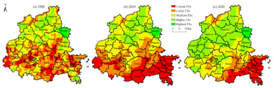 (a–c) Spatial distribution of ecosystem services from 2000 to 2020.