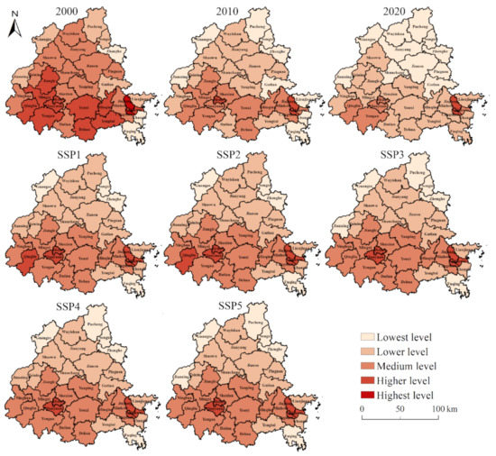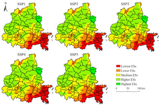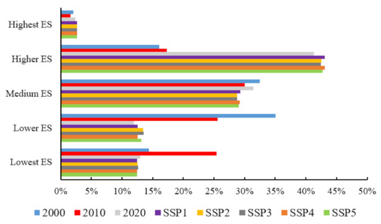 Based on the land use data obtained from the simulation, the InVEST and CASA models were used to evaluate the ESs under the five SSPs scenarios in the Min River Basin. The statistics and spatial distribution of the research results are shown in Figure 6 and Figure 7. The results show that ESs in Min River Basin will increase in different degrees under the five SSPs scenarios in 2030. Compared with the beginning of the study period, the higher-ESs areas increased and lower-ESs areas will be decreased significantly under the five SSPs scenarios, indicating that ecological functions will be improved with the enhancement of human ecological protection awareness and practical actions in the future. The spatial pattern will present little difference from that of 2020, showing a “high in the south and low in the north” pattern. The highest- and higher-ES areas were mainly concentrated in the south, while the lowest- and lower-ESs areas were concentrated in the southeast of the study area. In the SSP1 scenario, the improvement of ESs is the most significant, with the areas of highest- and higher-ES areas increasing by 4.2% and 11.5%, respectively. For example, in Shaowu, the second batch of national comprehensive trials of new urbanization, the local government followed the principles of sustainable development; improved the conservation and intensification of urban area; and protected cropland, forest, and grassland, resulting in enhanced ESs such as water conservation and food supply. The ESs of the Min River Basin were the lowest under the SSP3 scenario. For example, between 2020 and 2030, Yong’an and Datian would have transformed from higher- and medium-ES areas to medium- and lower-ESs areas, respectively. The main reason for this is that, under the situation of regional competition, the possibility of mining resources is intensified, and the natural broad-leafed forest is destroyed. In addition, the above regions are located in the Dayun Mountains, with serious mountain fragmentation and fragile ecosystems. Therefore, their ESs were the lowest in the five scenarios.