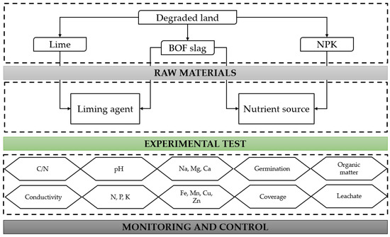 Liming improves the physical properties of soil through increasing base cations [45]. Calcium and magnesium cations can bind to organic matter as well as mineral colloids. Because of the beneficial influence of liming on soil structure, there has been much research on the use of acid-neutralising materials for improving degraded soils [46]. Some slags are used as liming materials to adjust soil pH and soil conductivity and to increase base saturation and cation exchange capacity [47]. BOF slag offers a range of environmental benefits, including being used as liming material which can substitute natural lime products. Therefore, this first test is proposed to analyse the technical feasibility of BOF slag for liming instead of natural lime.