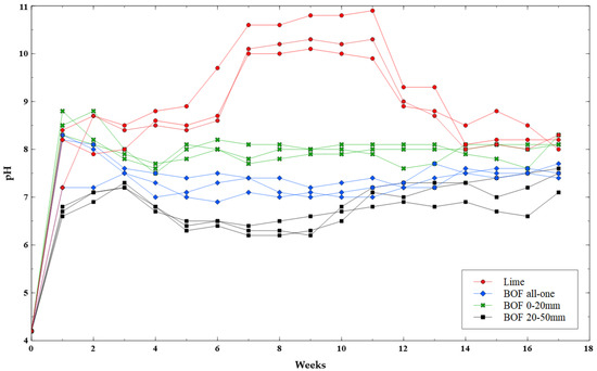 It is interesting to analyse the performance of lime pots that reached the highest pH levels. All BOF slag samples had an initial peak that decreased after 2–3 weeks. However, the lime pots continued to increase until week 11, when they decreased to a pH of 8–9. This could imply that the effect of lime decreases faster over time, while the slag remains more stable.