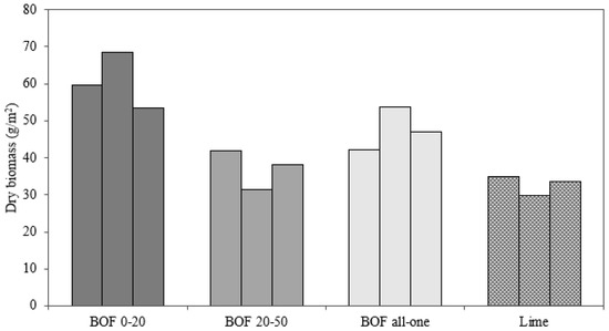 The analysis of the dry biomass after 14 weeks obtained after cutting and drying each sample also shows clear differences (Figure 3). The pots with lime had the lowest percentages and the mixes with BOF slag with a particle size of 0–20 mm had the highest values. Once again, an intermediate solution was slag with all-one grain size.