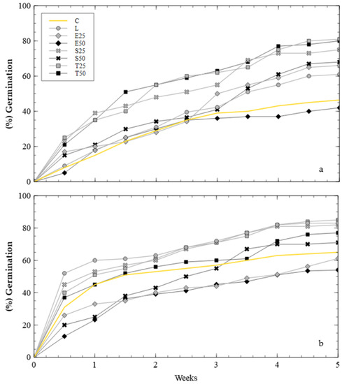 Germination rate: (a) samples without NPK; (b) samples with NPK.