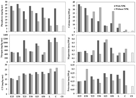 There was no significant difference between amendments with NPK (p > 0.05). However, as can be seen in the figure, samples with fertiliser had lower Ca values. This lower concentration of Ca could be due to the larger quantities of other cations, such as K competing with Ca and Mg cations [60]. Nevertheless, this is not the case for the pots with 0–20 mm slag since amendments E25 and E50 had extremely high levels of calcium both with and without fertiliser.