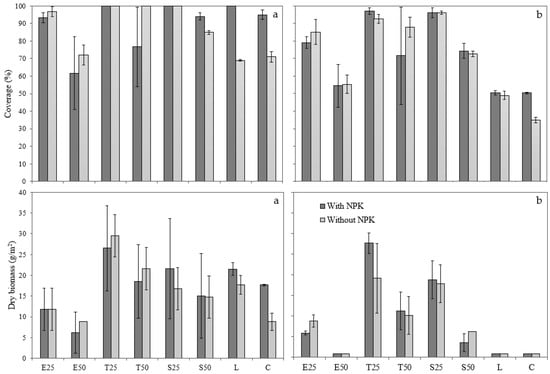 Coverage rate (%) and dry biomass (g m−2): (a) first cut after 5 weeks; (b) second cut after 10 weeks.