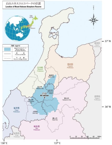 - Mount Hakusan Biosphere Reserve, Japan. Available online: https://en.unesco.org/biosphere/aspac/mount-hakusan (accessed on 25 January 2022).