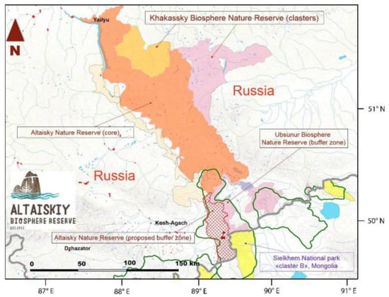 The protected areas of the Altai Republic are closely related to the protected areas of the neighboring regions of Russia and form the so-called Altai-Sayan ecoregion, which is included in the “Global-200” list (the World Wildlife Fund’s Living Planet Campaign), a list of untouched or less changed ecoregions of the world in which 90% of the planet’s biodiversity is concentrated. An example of the ABR can be seen on the map shown in Figure 3). Clusters of two other State Reserves—Khakassky (The Republic of Khakassia) and Ubsunurskaya Hollow (The Republic of Tuva)—adjoin the borders of the ABR. All three protected areas have a biosphere status at the national level and form a single, specially protected area—an interregional biosphere reserve.