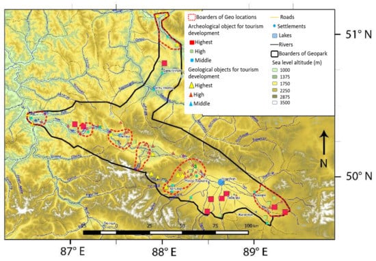 The Geopark Altai, a Regional Geopark, with a total area of over 14,500 km2, is located in the center of the Altai Republic (south-east of Western Siberia) and stretches along the Chuya and Katun Rivers and almost reaches the borders with Mongolia. Due to its location, two clusters are distinguished in the geopark—“Chuisky” and “Teletsky”—covering its lower part and Lake Teletskoye to the Korbu waterfall (Figure 4). An important feature of the Altai Geopark is its geological and geographical diversity. Rocks of the Precambrian age and almost the whole Phanerozoic (Paleozoic, Mesozoic, and Cenozoic eras) come to the surface here. More than 60 geological and geographical objects (geosites) are included in the Geopark. Some types of objects include structural geology, lithology, mineralogy, geomorphology, karst, glaciation (modern and ancient), and objects formed by exogenous processes [32]. On the territory of the geopark, there are unique hydrological objects: Teletskoye Lake and the Chuya, Bashkaus, and Chulyshman Rivers.
