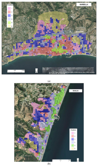 The spatial distribution of the clusters in the three study areas reflects the diversity of dominant urban morphologies in each municipality and the territorial processes that have generated them. For example, cluster 3, which is particularly observed in urban centres, is especially evident in Marbella, the most populous of the three cases considered. The same occurs with the areas included in cluster 4: historic centres and communication axes. Although communication axes are observed in all the study areas, they are especially highlighted in Manilva, whose expansion has been largely around the old N340 road.
