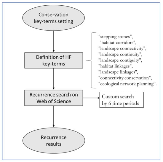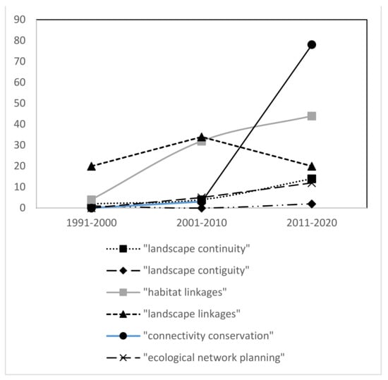 In this work, we aimed at describing the temporal trends of the different terms used in the HF arena, quantifying their number (and frequency) of recurrences to obtain data on use in the decades from 1960 to 2020. In particular, we hypothesize (i) use of the key terms related to the larger landscape scale in recent years due to a change in perspective: from patch/corridor in the 1980s to the landscape scale in the 1990s (e.g., []), and (ii) more frequent recurrence of the term “connectivity conservation” rather than “ecological network planning” in the scientific research web search engine, given that the use of these terms pertains to different disciplinary arenas (scientific/biological vs. urban planning ones, respectively; see []). We believe that knowing the temporal trends of the different terms used in the HF-related disciplines can contribute to the search for terminological standards, favoring the disciplinary exchange between the conservation vs. planning arenas. Although analogous reviews in this regard are available (e.g., []), to our knowledge this is the first review comparing the use of different HF-related terms on such a long time range.