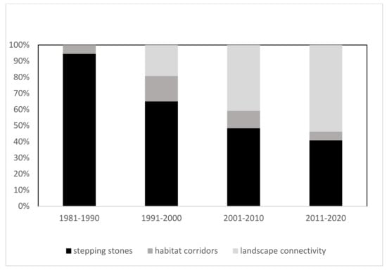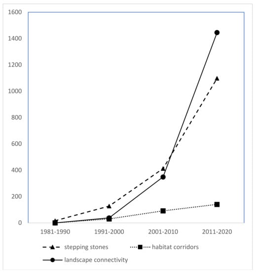 Among the focal key terms, we observed a progressive increase in the use of “stepping stones”, “habitat corridors”, and “landscape connectivity” from 1981 to 2020, with the most marked trends recorded for “landscape connectivity” and for “stepping stones”, with a significant increase in the last decade (2011–2020; respectively, χ2 = 1313.6, and χ2 = 571.08, both of them: p < 0.001; Figure 2).