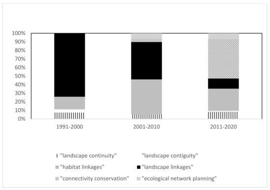 Except for “landscape linkage”, which showed a progressive decline, all the other terms showed a progressive incremental trend. Among these, the concept of “connectivity conservation” showed the most markedly significant increase (χ2 = 57.97, p < 0.001), establishing itself as the most used in the last decade. Therefore, we observed a clear turnover, with the replacement of the concept of “landscape linkages”, widely used in the 1990s, with that of “connectivity conservation”. The concept of “ecological network planning”, which appears in the early 2000s in the scientific literature, showed, however, a low frequency of recurrences in recent decades (Figure 5).