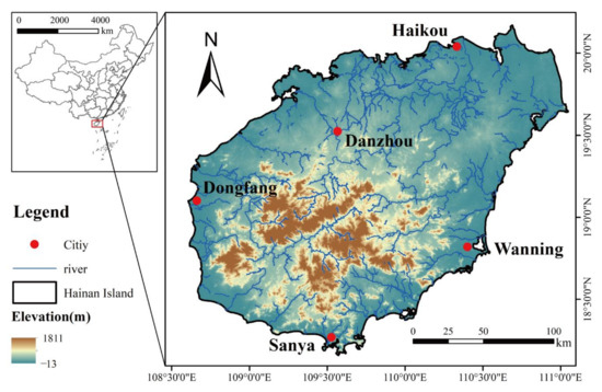 Hainan Island is located in the northwestern part of the South China Sea, 108°37′–111°03′ E and 18°10′–20°10′ N (Figure 1). It is the second largest island in China, with a total area of 33,900 km2 and a population of about 10.08 million people, and is separated from Guangdong Province in the north by the Qiongzhou Strait and from Vietnam in the west by the Beibu Gulf. Hainan Island has an elliptical land plane, with a high altitude in the southwest and a low altitude in the northeast, with a clear gradient structure. According to the Köppen climate classification, Hainan Island is mainly located in the tropical monsoon climate (Aw) and the tropical wet and dry or savanna climate (Am) regions, with a few areas in the humid subtropical climate (Cwa) [60] with an average annual precipitation of 1639 mm, an average annual temperature of 22–27 °C, and 1750–2650 h of sunshine per year. Hainan Island is rich in flora and fauna, with a high proportion of cropland in the total area of the island and the basic mode of agriculture being rice fields. In addition, Hainan Island is an important tourist destination in China and was established as a special economic zone in 1988 and as a pilot free trade zone in 2018.