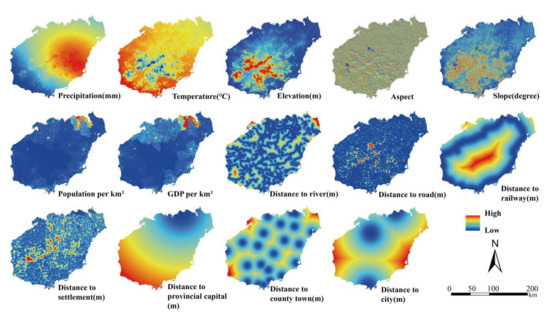 The data that drive LULC change can be divided into three main categories (Figure 2): (1) meteorological data from the National Meteorological Information Center, which were processed to obtain annual mean temperature maps and annual mean precipitation maps; (2) socio-economic data from the National Earth System Science Data Center, including population density maps, GDP maps, railway maps, road maps, provincial capital location, city location, county location, and village location, while the distance map was obtained through the ArcMap 10.8 Euclidean Distance Tool; (3) physical geography data including DEM, slope map, aspect map, and river map. The DEM was obtained from the United States Geological Survey (USGS), the river map from the National Earth System Science Data Center, and the slope map and the aspect map were obtained by processing the DEM in ArcMap 10.8.