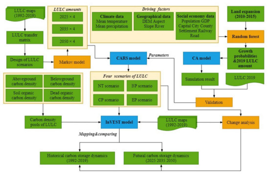 The research consisted of three main parts, namely, analysis of historical LULC dynamics, simulation of multiple scenarios of future LULC, and estimation and comparison of carbon storage under different LULC. Figure 3 shows the overall research flow of this study.