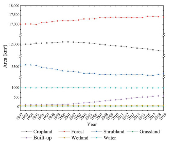 The LULC data from 1992 to 2019 were used for the change analysis, and the data of 2010, 2015, and 2019 were also used for the LULC simulation combined with the PLUS model to obtain suitable model parameters. The driving factor year of LULC transition was kept around 2015, which is in line with the operating principle of the PLUS model [48], and ensures the accuracy of future LULC simulations by simulating and validating the LULC distribution in 2019. Elevation rarely changes significantly over time, and combined with data accuracy, we chose DEM data with a resolution of 30 m in 2000.