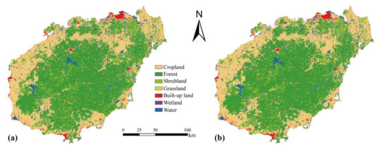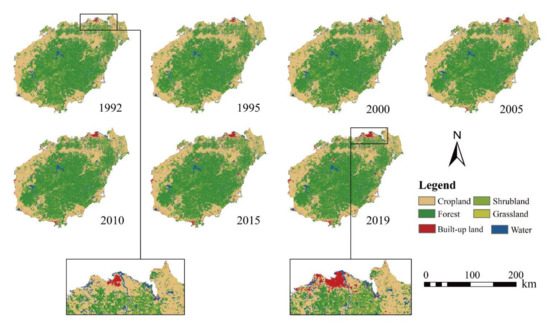 In this study, we used data from multiple sources (Table 1). LULC data from 1992 to 2019 were sourced from the European Space Agency’s (ESA) Climate Change Initiative (CCI). The LULC data were used for LULC dynamics analysis, carbon storage calculations, and future LULC scenario modelling. The overall accuracy of this dataset is above 90% and covers a full range of years, which is well suited to the needs of this study. CCI’s original maps cover many kinds of LULC types all over the earth, and there are seven land use and land cover types in Hainan Island: cropland, forest, shrubland, grassland, built-up land, wetland, and water. It should be noted that these classifications can represent basic land use and land cover types, but cannot reflect tree species differences or tree ages in more detail. For forest and shrubland, for example, the classification is based on the volume of vegetation and height. Due to the limitation of resolution, this classification standard has been widely used in previous macro-scale related research [54,55,61], and we also follow this standard. Further, built-up land refers to the ground occupied by towns and cities, but also includes some large villages and enterprise plants. Cropland denotes rice fields and forest denotes the surface occupied by various types of trees. Shrubland represents the surface occupied by various types of shrubs. Grassland represents the land surface occupied by various types of herbaceous plants. Wetland represents the land surface occupied by mangroves. Water represents the land surface occupied by rivers, reservoirs, lakes, etc.