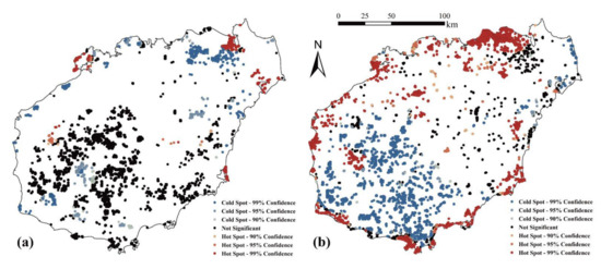 The Getis-Ord Gi* tool was used to identify spatial clusters of statistically significant increases and decreases in carbon density to analyse trends in the spatial distribution of carbon density change. The Getis-Ord Gi* tool uses z-values, p-values, and confidence intervals to characterise the spatial clustering pattern of the input elements. Higher z-values and smaller p-values indicate high value clustering, while lower z-values and smaller p-values indicate low value clustering. When the p-value is greater than 0.1 it is not considered to be significant. Corresponding the p- and z-values, there are four confidence intervals of +3/−3, +2/−2, +1/−1, and 0, representing statistical significance at the 99%, 95%, and 90% confidence levels respectively, with positive values representing hot spots and negative values representing cold spots [69].