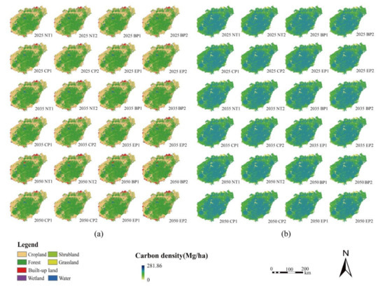 Pattern 2 also differs from Pattern 1 in terms of the spatial distribution of LULC and carbon storage, with built-up land areas expanding further outwards along Pattern 1, and the built-up land area of the southwest coastline of Hainan Island becoming more shaped; shrubland is more widely scattered among forest and cropland; and forest and cropland become shrunken and discrete compared to Pattern 1, but the overall pattern remains the same. The carbon storage at the edges of the built-up land areas is further reduced, with a more pronounced ring of low carbon storage along the coastal zone of Hainan Island, and more patches of low carbon density within the high carbon density areas of forest in Pattern 1 (Figure 11).