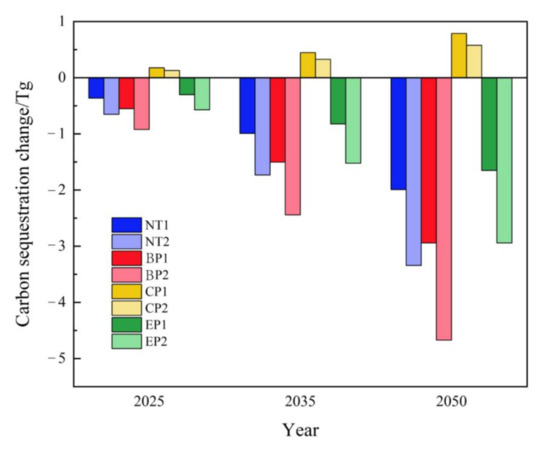 The analysis above shows that there are significant differences in LULC and carbon storage change trends between the period before and after 2000, reflecting changes in potential drivers such as development policies in the latter period compared to the previous period, and that predicting LULC and carbon storage dynamics after 2019 using only one development model is not sufficiently objective. This paper therefore uses the probability of LULC transfer between 2000 and 2019 as the basis (Pattern 2) to predict future LULC under four scenarios, NT, BP, CP, and EP, and calculates carbon storage. The results show that the built-up land area increases for all four development scenarios compared to the probability of transfer between 1992 and 2019 (Pattern 1), with Pattern 2 under BP in 2050 corresponding to a built-up land area of 1469.34 km2; the area of forest and cropland decreases, while the area of shrubland increases significantly, depending on the year and scenario, with increases ranging from 43.92 to 209.25 km2. In terms of carbon storage, all development scenarios under Pattern 2 show a decrease in LULC carbon storage compared to Pattern 1, and the difference in carbon storage between the same scenarios increases over time. A total of 425.02 Tg of carbon is stored under Pattern 2 in 2050, a decrease of 4.67 Tg compared to 2019 (Figure 12).