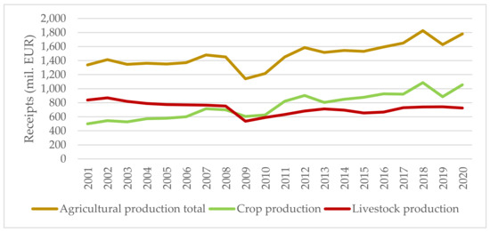 Development of sales of agricultural products in the Slovak Republic for the period of 2001–2020. Source: [18].