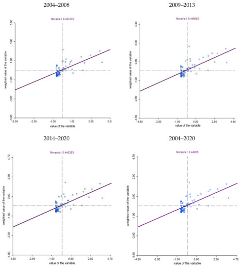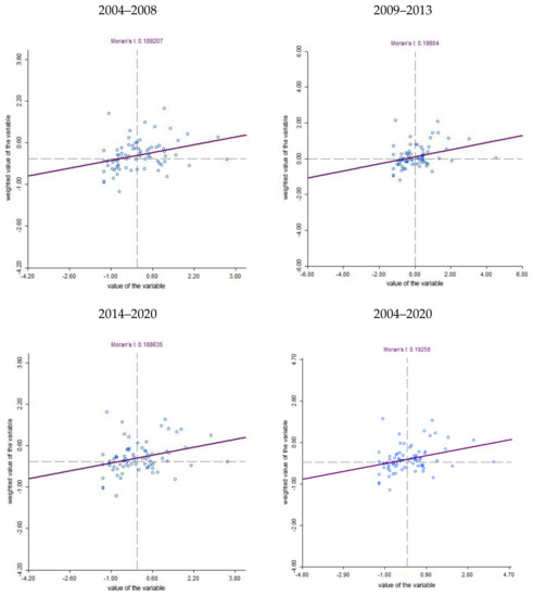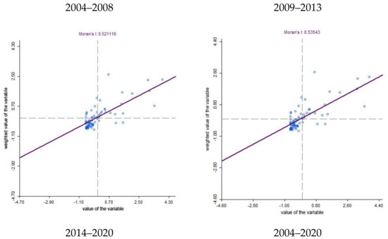 Univariate Moran’s I scatter plots for the size of oilseed harvesting areas for the years 2004–2008, 2009–2013, 2014–2020, and 2004–2020. Source: [18]; authors’ own research.