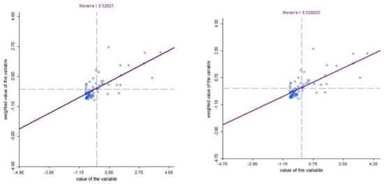 According to Anselin et. al. [15], if similar phenomena or attributes are in close vicinity, there is a positive spatial autocorrelation. If there is a grouping of significantly different values, there is a negative spatial autocorrelation. If the data in an area are located such that close values are not related, the analyzed values are statistically insignificant. In our paper, we analyzed the variable using Moran’s index. The following applies to Moran’s Index (1):