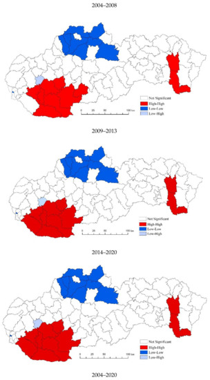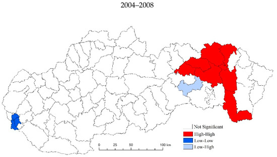 The use of spatial reference data on cereal harvesting areas in the districts of Slovakia offers an understanding of spatial–analytical links in this area of interest. The method of spatial autocorrelation allows us to define clusters of regions from the monitored indicator point of view. When evaluating the spatial autocorrelation of the monitored indicator in the period of 2004–2020, we identified localities with different intensity. When evaluating the developmental changes in the acreage of cereal harvesting areas by spatial autocorrelation in the monitored years (2004–2008, 2009–2013, 2014–2020, and 2004–2020), we observed only minimal differences. The highest values of harvesting areas were achieved in the given periods in the regions of the Podunajská nížina Nitra and Trnava. These were the areas of the largest cereal cultivation. In the regions in the north of Slovakia, low acreage areas were achieved due to less suitable natural conditions for cultivation. In our research, this manifested itself in the form of positive spatial autocorrelation. The analysis identified nine districts mainly in the southwestern part of Slovakia (Dunajská Streda, Komárno, Nové Zámky, Levice, Nitra, Šaľa, Trnava, and Hlohovec), which we included in the high-high quadrant (Figure 3). The Moran’s diagram for the period of 2004–2020 for the monitored indicator showed a value of 0.528025, which indicated a slightly positive spatial autocorrelation (Figure 4). The given value indicated the clustering of similar values of the indicator (high with high and low with low). The second region that showed positive spatial autocorrelation (low-low) was identified in the northern part of Slovakia. As with the previous cluster, nine districts belonged to the given cluster (Liptovský Mikuláš, Ružomberok, Dolný Kubín, Námestovo, Čadca, Žilina, Martin, Bytča, and Považská Bystrica). The district of Bratislava I also joined this group of districts. As mentioned, the global Moran’s index does not in itself reveal the different degrees of spatial relations within one set.
